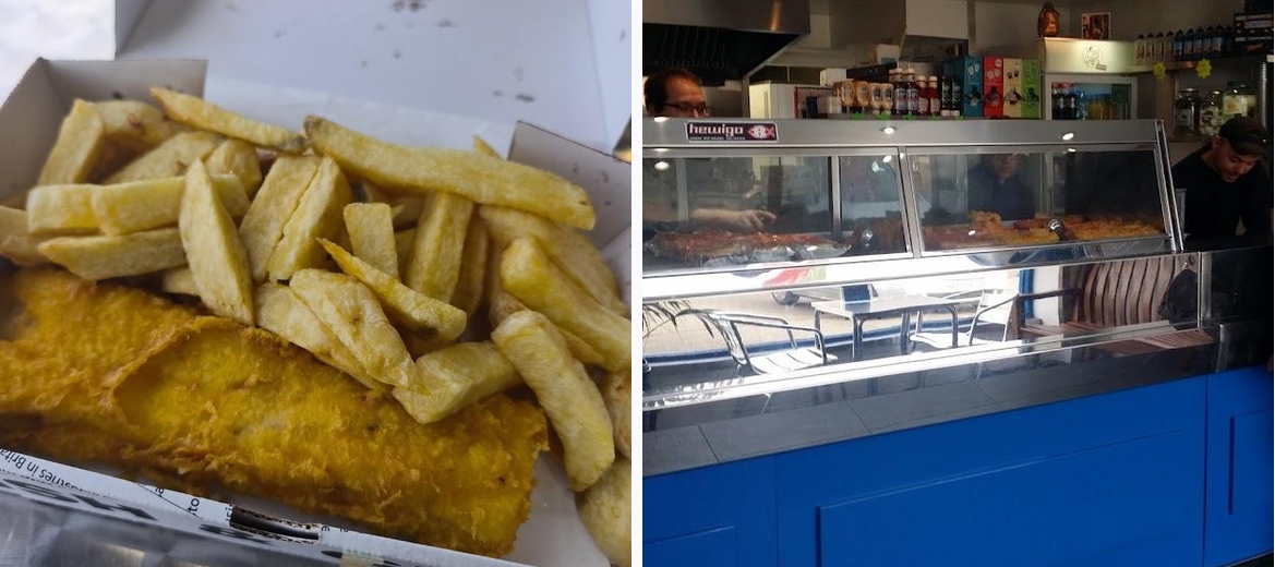 Great fish and chips. Also spam fritters. Miniture cakes are great.service excellent and atmosphere in shop is lovely.